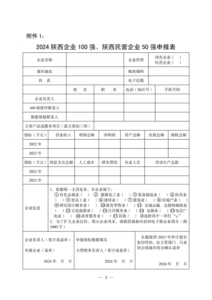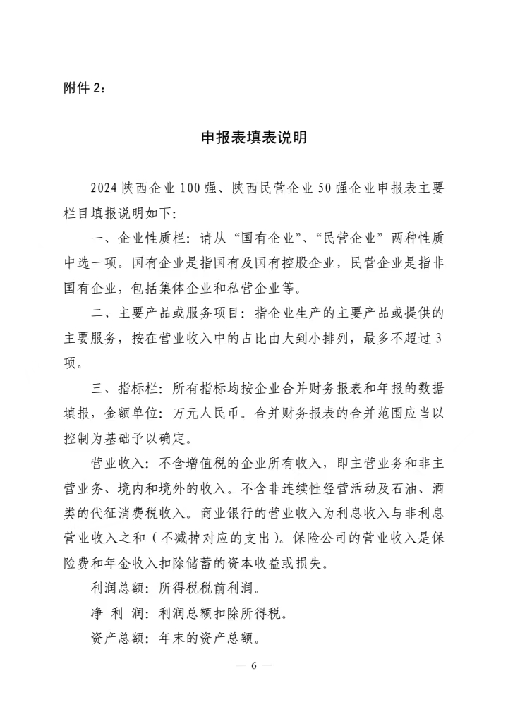 各有關(guān)企業(yè)、協(xié)會(huì)和有關(guān)單位: 中國(guó)企業(yè)聯(lián)合會(huì)/企業(yè)家協(xié)會(huì)(以下簡(jiǎn)稱中企協(xié))連續(xù)22年向社會(huì)發(fā)布了中國(guó)企業(yè)500強(qiáng)榜單及《中國(guó)500強(qiáng)企業(yè)發(fā)展報(bào)告》,全國(guó)大部分省市區(qū)先后開展了地區(qū)企業(yè)100強(qiáng)排序發(fā)布工作。 2012年,經(jīng)省政府領(lǐng)導(dǎo)同意,在省發(fā)改委、工信廳、財(cái)政廳、人社廳、商務(wù)廳、國(guó)資委、統(tǒng)計(jì)局、地方金融監(jiān)管局、省總工會(huì)等政府部門的大力支持下,我會(huì)連續(xù)12年開展了“陜西企業(yè)100強(qiáng)”排序和發(fā)布工作,連續(xù)5年發(fā)布了陜西民營(yíng)企業(yè)50強(qiáng)榜單,并編印出版了《陜西100強(qiáng)企業(yè)分析報(bào)告》(以下簡(jiǎn)稱《百?gòu)?qiáng)企業(yè)分析報(bào)告》),受到了政府部門、企業(yè)及媒體等社會(huì)各界的普遍歡迎和廣泛認(rèn)可。 為深入貫徹落實(shí)黨的二十大精神和習(xí)近平總書記歷次來陜考察重要講話重要指示精神,認(rèn)真落實(shí)中央經(jīng)濟(jì)工作會(huì)議部署要求,引導(dǎo)我省企業(yè)全面貫徹新發(fā)展理念,培育發(fā)展新質(zhì)生產(chǎn)力,賦能企業(yè)高質(zhì)量發(fā)展,為推進(jìn)中國(guó)式現(xiàn)代化陜西新篇章做出積極貢獻(xiàn),我會(huì)決定繼續(xù)開展2024陜西企業(yè)100強(qiáng)和陜西民營(yíng)企業(yè)50強(qiáng)排序發(fā)布活動(dòng)。 依據(jù)2023年企業(yè)營(yíng)業(yè)收入,我會(huì)在政府有關(guān)部門和各行業(yè)協(xié)會(huì)、各地方企業(yè)家協(xié)會(huì)/企業(yè)聯(lián)合會(huì)的支持下,在以往工作的基礎(chǔ)上,初步確定貴企業(yè)為2024陜西100強(qiáng)或陜西民營(yíng)50強(qiáng)候選企業(yè),希望貴企業(yè)能按要求及時(shí)申報(bào)?,F(xiàn)將排序的有關(guān)事項(xiàng)通知如下: 一、排序原則 排序依據(jù)2023年度營(yíng)業(yè)收入,在企業(yè)自愿申報(bào)基礎(chǔ)上,由陜西百?gòu)?qiáng)企業(yè)排序?qū)彾ㄎ瘑T會(huì)統(tǒng)一審核,形成客觀公正的排序結(jié)果。 二、申報(bào)資格 凡在陜西省境內(nèi)注冊(cè)、獨(dú)立核算的企業(yè)均有資格申報(bào)參加排序(不包括行政性公司、資產(chǎn)經(jīng)營(yíng)公司、外資企業(yè),但包括在境外注冊(cè)、投資主體為中國(guó)自然人或者法人、主要業(yè)務(wù)在境內(nèi)的企業(yè))。屬于集團(tuán)公司的,只能由母公司申報(bào),在陜西境內(nèi)的中央直屬企業(yè)可獨(dú)立申報(bào)。申報(bào)2024陜西100強(qiáng)的企業(yè),2023年?duì)I業(yè)收入應(yīng)達(dá)到20億元(人民幣);申報(bào)2024陜西民營(yíng)50強(qiáng)的企業(yè),2023年?duì)I業(yè)收入應(yīng)達(dá)到5億元(人民幣)。 為了保證數(shù)據(jù)的客觀公正,申報(bào)企業(yè)需要提供由會(huì)計(jì)師事務(wù)所或?qū)徲?jì)機(jī)構(gòu)確認(rèn)的審計(jì)報(bào)告復(fù)印件。未能提供的,需提交能夠證明企業(yè)數(shù)據(jù)真實(shí)性的可靠材料,如可由審計(jì)機(jī)構(gòu)、行業(yè)協(xié)會(huì)、地市協(xié)會(huì)或主管部門蓋章確認(rèn)。凡只提供企業(yè)申報(bào)表或者數(shù)據(jù)不完整又無法確認(rèn)的,均不納入排序范圍。 三、指標(biāo)填報(bào) 2024陜西企業(yè)100強(qiáng)、陜西民營(yíng)企業(yè)50強(qiáng)排序工作按照國(guó)際通行的方式,參照世界企業(yè)500強(qiáng)和中國(guó)企業(yè)500強(qiáng)排序辦法,依據(jù)企業(yè)2023年度的營(yíng)業(yè)收入進(jìn)行排序。同時(shí)設(shè)置利潤(rùn)總額、資產(chǎn)總額、納稅總額、從業(yè)人數(shù)等多項(xiàng)指標(biāo)(詳見附件),對(duì)100強(qiáng)企業(yè)進(jìn)行綜合分析,編印《百?gòu)?qiáng)企業(yè)分析報(bào)告》。 四、排序工作的申報(bào)及發(fā)布 (一)申報(bào)。滿足申報(bào)條件的企業(yè)從接到通知之日起即可抓緊準(zhǔn)備資料,按要求填寫申報(bào)表。為了盡可能與中企協(xié)開展的中國(guó)企業(yè)500強(qiáng)排序接軌,保持同步運(yùn)作,希望我省符合條件的大企業(yè)大集團(tuán)積極主動(dòng)參與申報(bào),于2024年6月30日前完成申報(bào)工作。申報(bào)表請(qǐng)登陸我會(huì)網(wǎng)站m.giudew.com“相關(guān)下載”欄目下載。 (二)審定。企業(yè)申報(bào)結(jié)束后,我會(huì)對(duì)企業(yè)申報(bào)材料進(jìn)行審核匯總,提出排序初步名單,編寫《百?gòu)?qiáng)企業(yè)分析報(bào)告》草稿。隨后召開陜西企業(yè)100強(qiáng)及民營(yíng)企業(yè)50強(qiáng)排序?qū)彾ㄎ瘑T會(huì)會(huì)議,審議由我會(huì)擬定的排序名單和《百?gòu)?qiáng)企業(yè)分析報(bào)告》,確定最終排序結(jié)果。 (三)發(fā)布。我會(huì)擬在今年第四季度舉行百?gòu)?qiáng)企業(yè)排序發(fā)布會(huì),向社會(huì)公布“2024陜西企業(yè)100強(qiáng)”、“2024陜西民營(yíng)企業(yè)50強(qiáng)”排序名單,發(fā)布《百?gòu)?qiáng)企業(yè)分析報(bào)告》,邀請(qǐng)省內(nèi)主要媒體對(duì)排序發(fā)布工作進(jìn)行廣泛深度宣傳報(bào)道。 五、聯(lián)系方式 聯(lián) 系 人:劉會(huì)琴 白朝霞 張家赫 電話及傳真:029-85227536 88211873 電子信箱:sxsqyjxh@163.com 陜西百