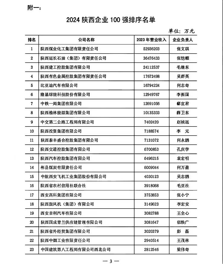 附一:2024陜西企業(yè)100強(qiáng)排序名單