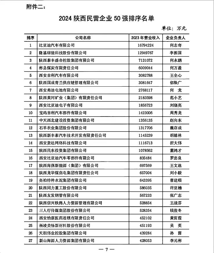 附二:2024陜西民營(yíng)企業(yè)50強(qiáng)排序名單